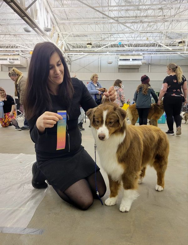 Rodeo a eu tout un week-end et a volé la vedette chez les bergers australiens. Il a commencé en douceur au premier concours en remportant winner dog. Au 2e concours il a fait Winner dog et Best Of Winners. Le lendemain, au 3e concours il a fait Best of Breed, group 4, Best puppy du groupe pour terminer le concours #3 avec un Best Puppy In Show et son titre de champion. Il a terminé son week-end avec un autre BOB, goupe 4 et un Best Puppy In group. Quel week-end incroyable pour Rodeo!!